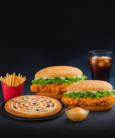 Pizza, Zinger Burgers (2), Drinks (2), Fries
