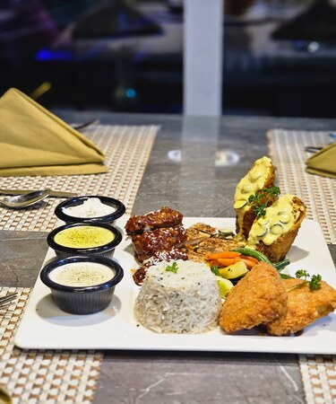 Chicken Wings (4pcs), Club Sandwich, Beef Steak (2pcs), Stuffed Chicken Strips (2pcs), Alfredo Pasta Small, Mushroom Sauce, Fries, Mash Potato, Veggies